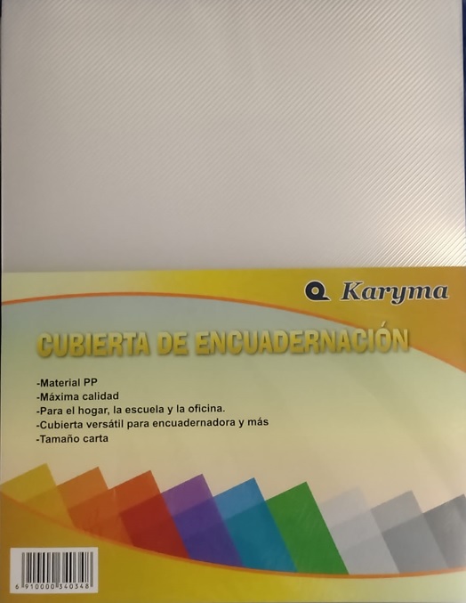 69TR. Tapa para Encuadernar Estriada Karyma 350 Mic, Carta Transparente (50). Características CÓDIGO 69TR También te puede gustar: 81R. Papel Seda Rojo, 50x70cm. 17grs, 50H CÓDIGO: 81R 80F. Papel Crepe Rosado, 50x200cm, 30%Estirado, 10H CÓDIGO: 80F 80L. Papel Crepe Lila, 50x200cm, 30%Estirado, 10H CÓDIGO: 80L volver a la lista